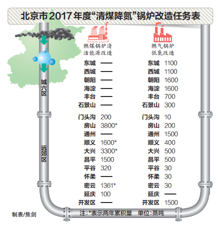 据悉,“清煤降氮”工程是完成2017年PM2.5年均浓度达到60微克/立方米目标的重要保障措施。根据2017年清洁空气行动计划的任务分解要求,2017年10月底前,全市要基本淘汰远郊区平原地区10蒸吨及以下和建成区35蒸吨及以下燃煤锅炉,完成4000蒸吨左右燃煤锅炉清洁能源改造任务,新建的燃气锅炉都必须达到氮氧化物30毫克/立方米的排放限值。其中,房山区、大兴区要淘汰包括燃煤集中供热中心在内的燃煤锅炉,实现辖区平原地区基本无燃煤锅炉。到2017年年底,各区要在政府网站上向社会公开辖区剩余未改造的在用燃煤锅炉清单,接受公众监督。