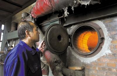 守护这些锅炉的工人师傅穆杰祥在查看供暖炉的燃烧情况。